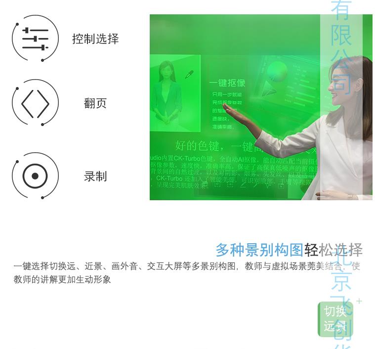 *2. 為滿足日常教學需要,不影響教師的正常教學,不改變教師的授課習慣,需支持觸摸大屏虛擬摳像,通過大屏進行ppt授課,同時進行即時、流暢的板書,不接受任何貼膜和綠幕等形式的摳像。