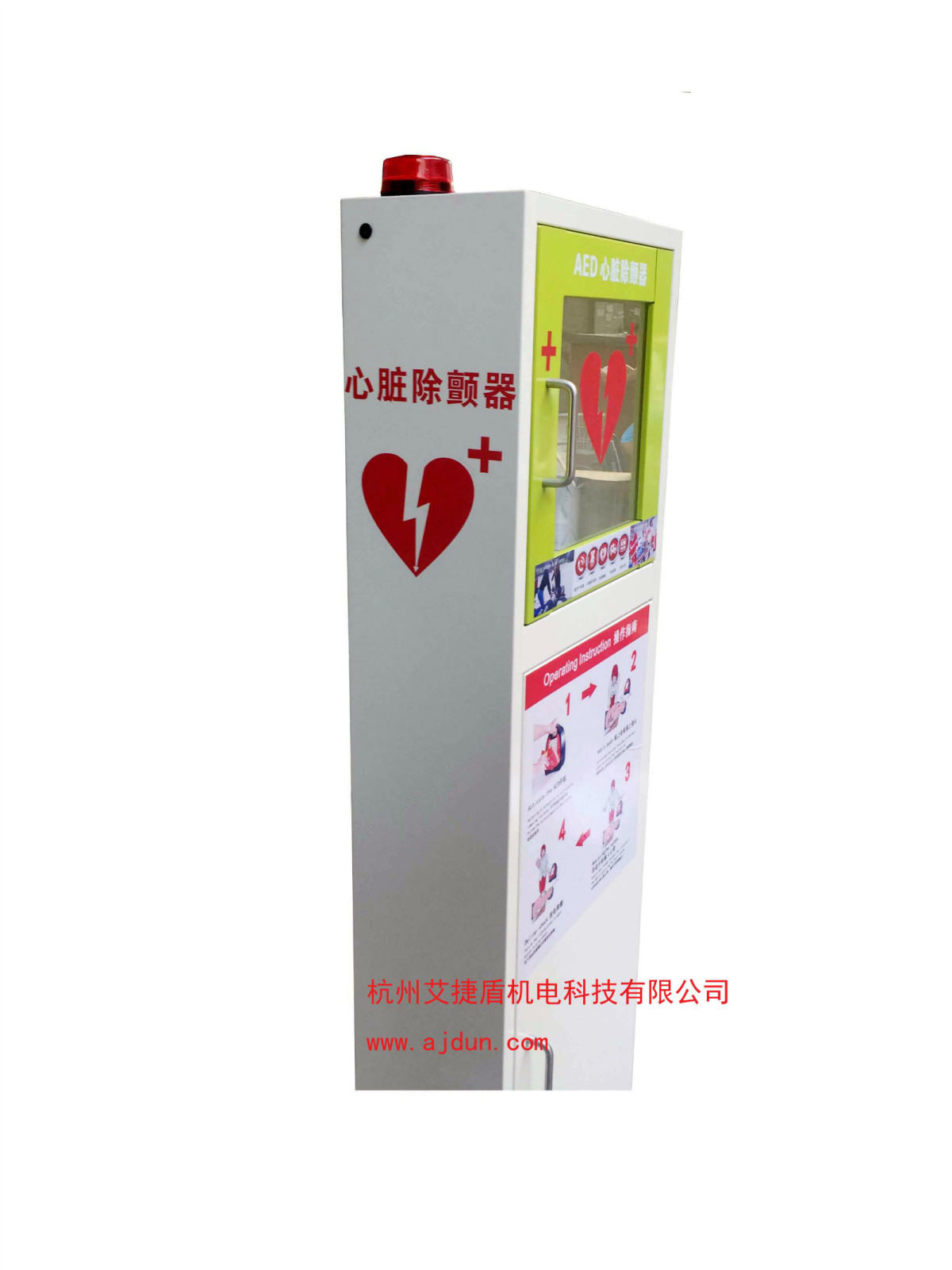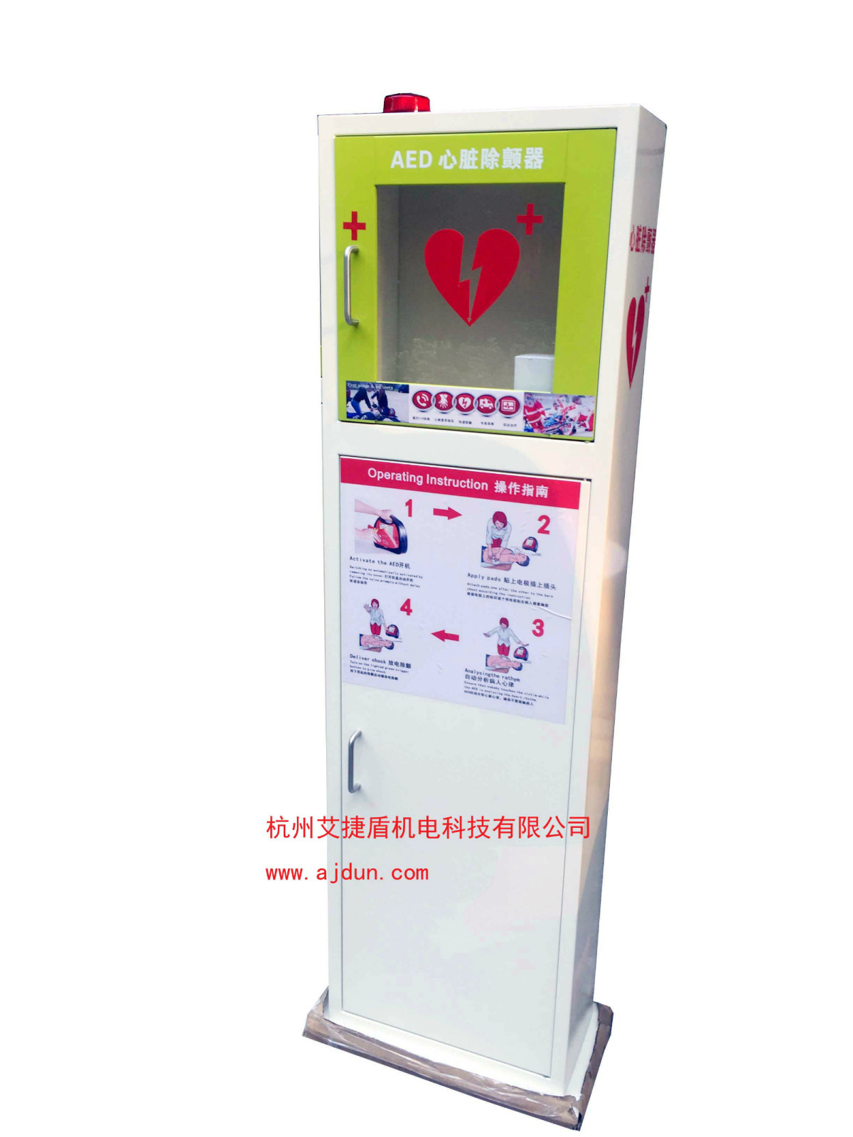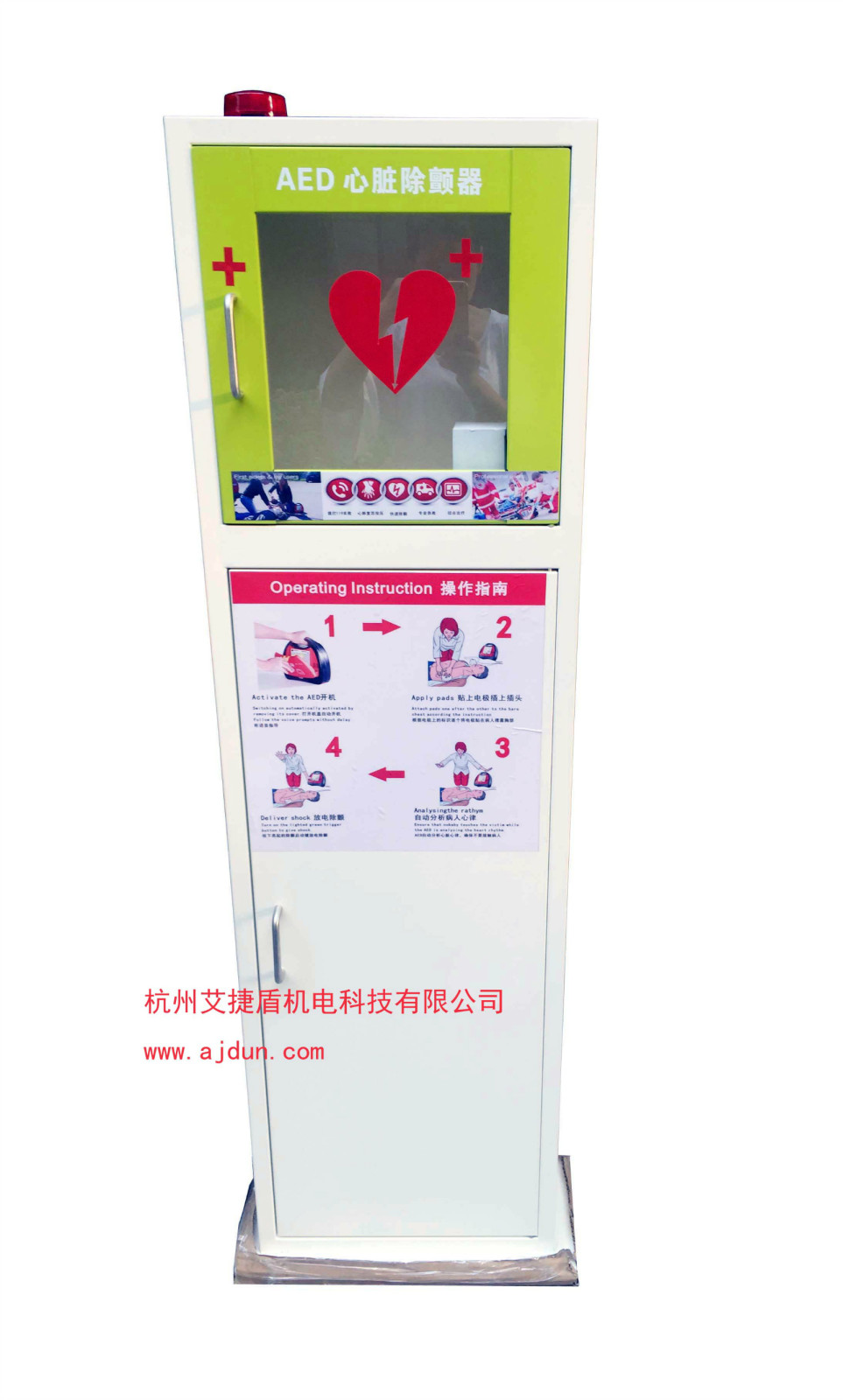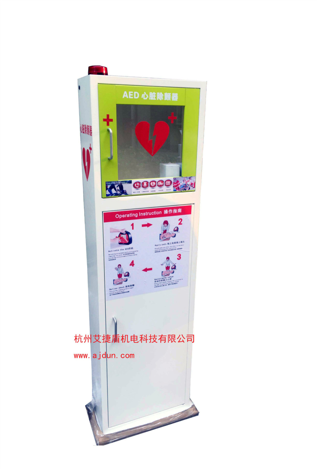 并隨箱配有觸發式高亮報警燈及蜂鳴器,在有緊急事件發生時一旦開啟箱門,即會觸發報警,可使人在最大范圍內發現有急救突發事件發生。 透過存放箱的透明窗可以清楚觀察箱內的aed自檢狀況及整個機器的使用狀態。 存放箱的功能尤其在一些公共社區及大型工廠車間中優勢最為明顯,可將存放箱固定于人群密集處,一旦發生需要急救的狀況,可快捷使用。